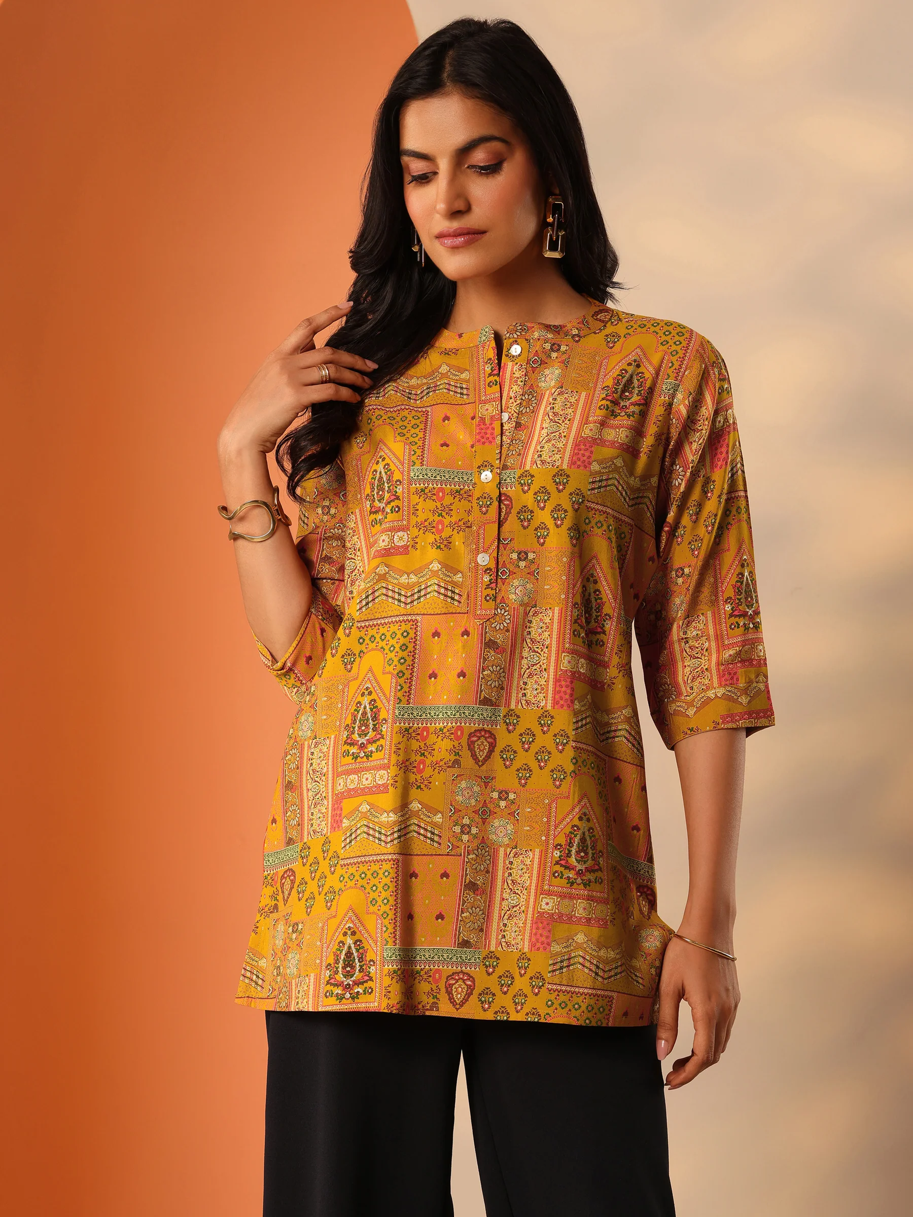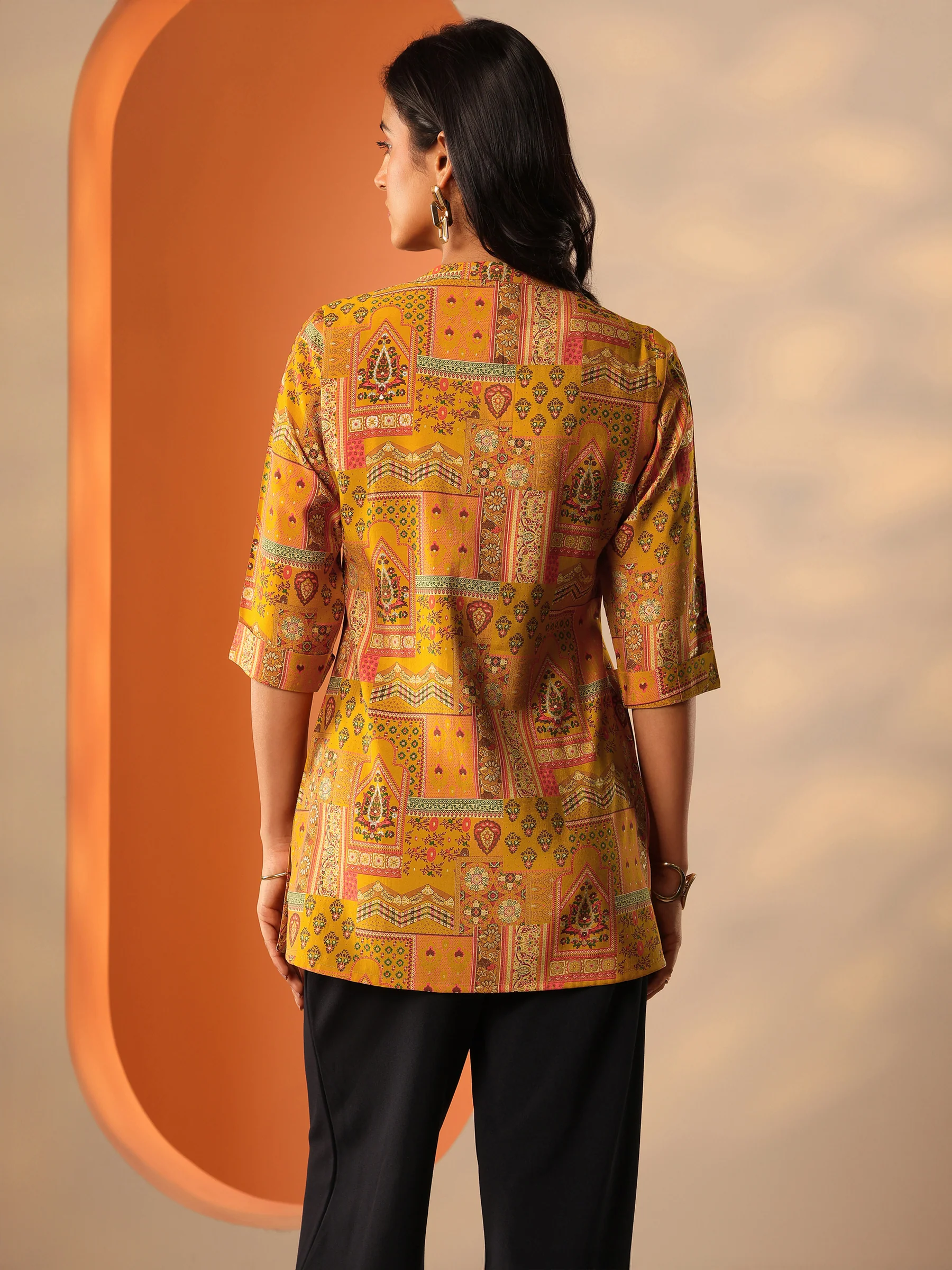 Mustard Printed Silk Blend Straight Short Kurti