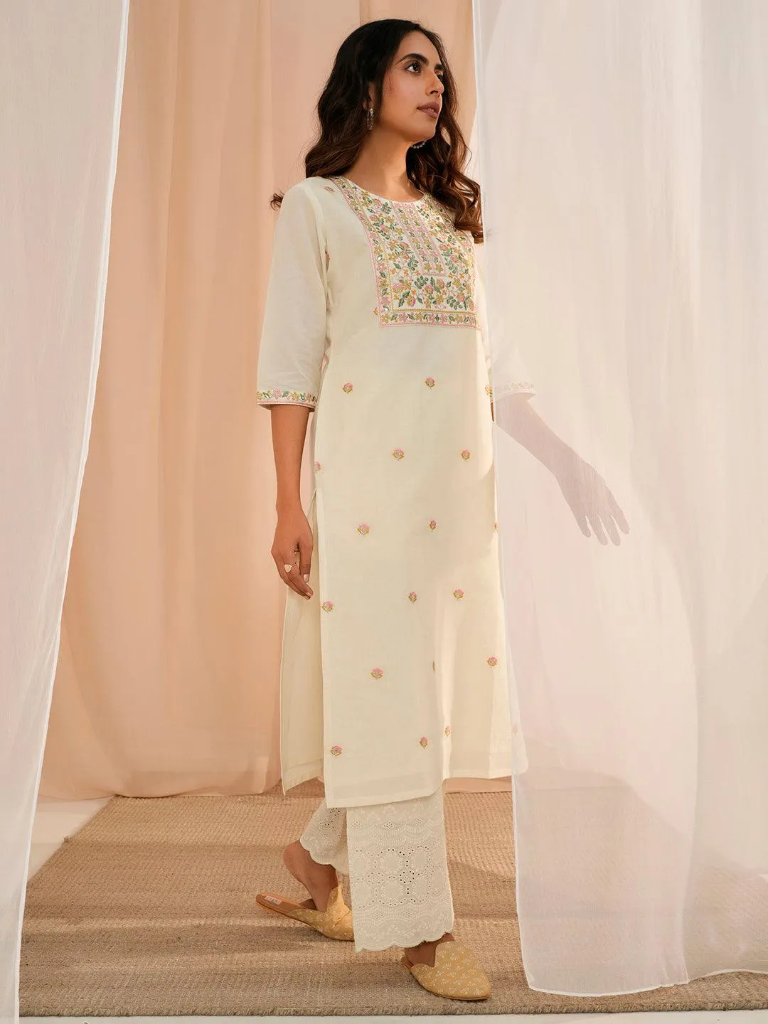 Off White Embroidered Cotton Straight Kurta